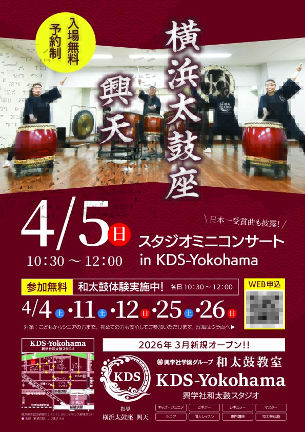 KDS-Yokohamaでは、地域の皆さまや「太鼓を始めてみたい」とお考えの方に向けて、スタジオミニコンサートを実施いたします。