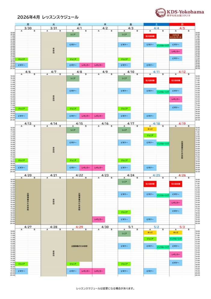 レッスンスケジュールは変更になる場合がありますのでご了承ください。